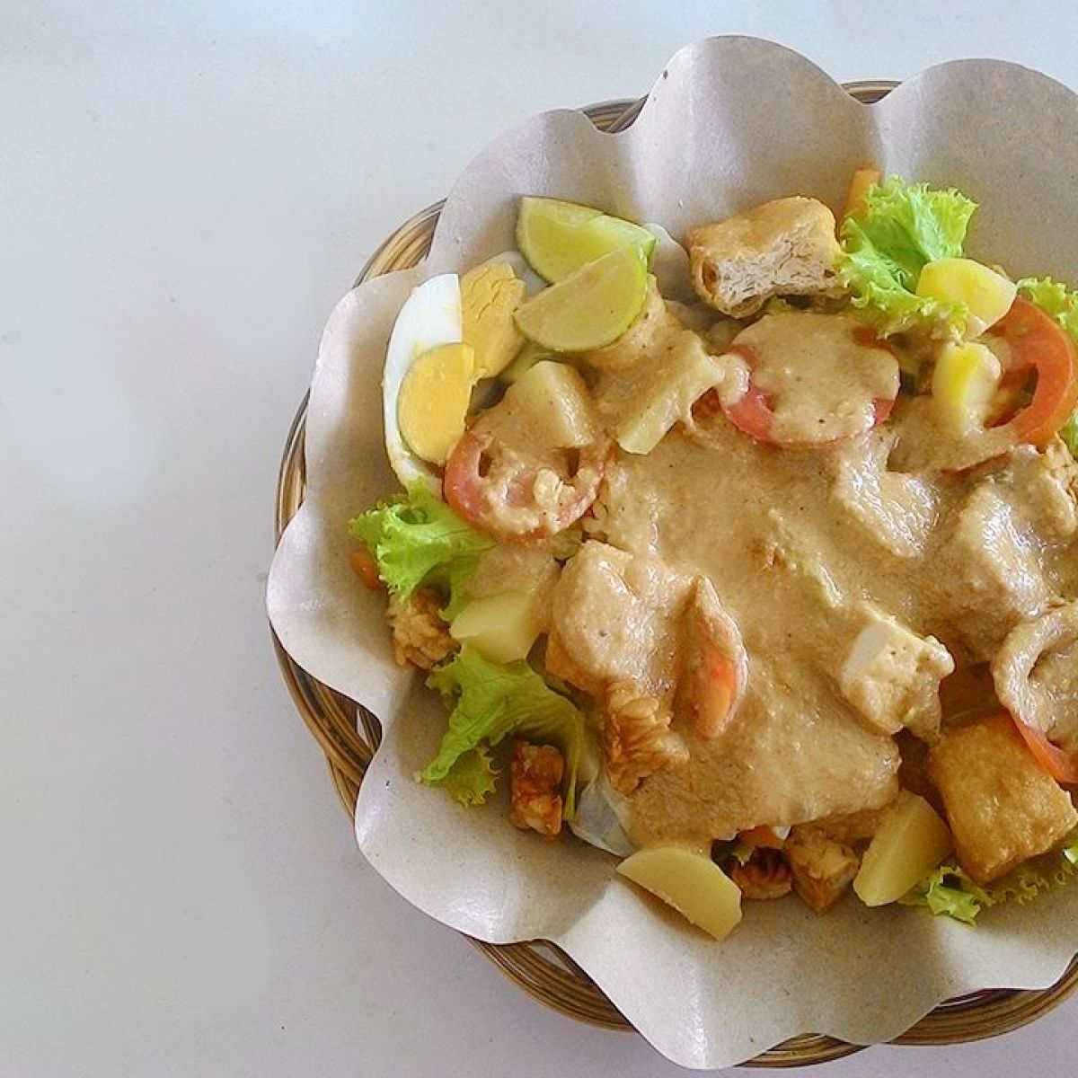 - Tuangkan bumbu kacang di atas semua bahan dengan merata. Kamu bisa menambahkan kerupuk dan irisan cabai sesuai selera.