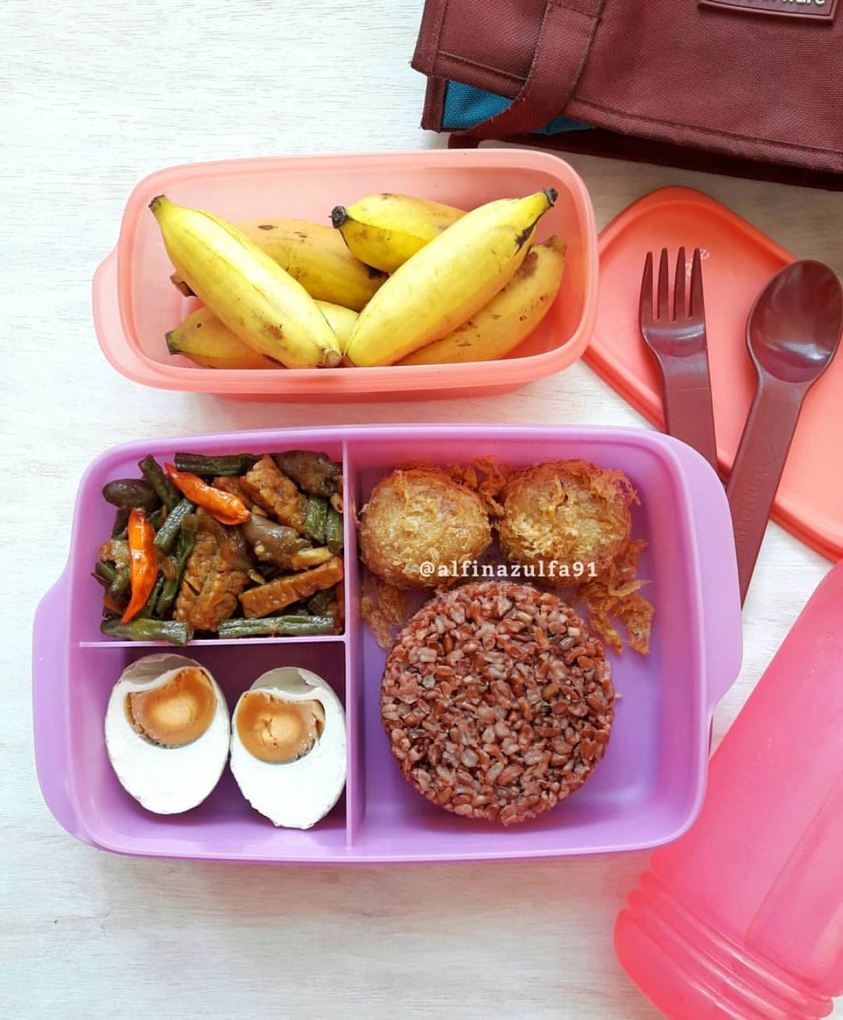Susun nasi merah, oseng tempe, kacang panjang, perkedel, dan telur asin dalam wadah bekal. Tambahkan air mineral dan buah pisang sebagai pelengkap yang segar.