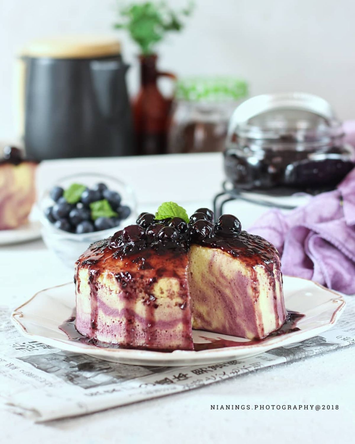- Siapkan loyang berukuran 14 cm yang sudah dilapisi kertas roti. Tuang adonan plain dan adonan taro secara bergantian ke dalam loyang. Gunakan sumpit atau garpu untuk membuat pola marble. Hentakkan loyang beberapa kali untuk mengeluarkan gelembung udara.