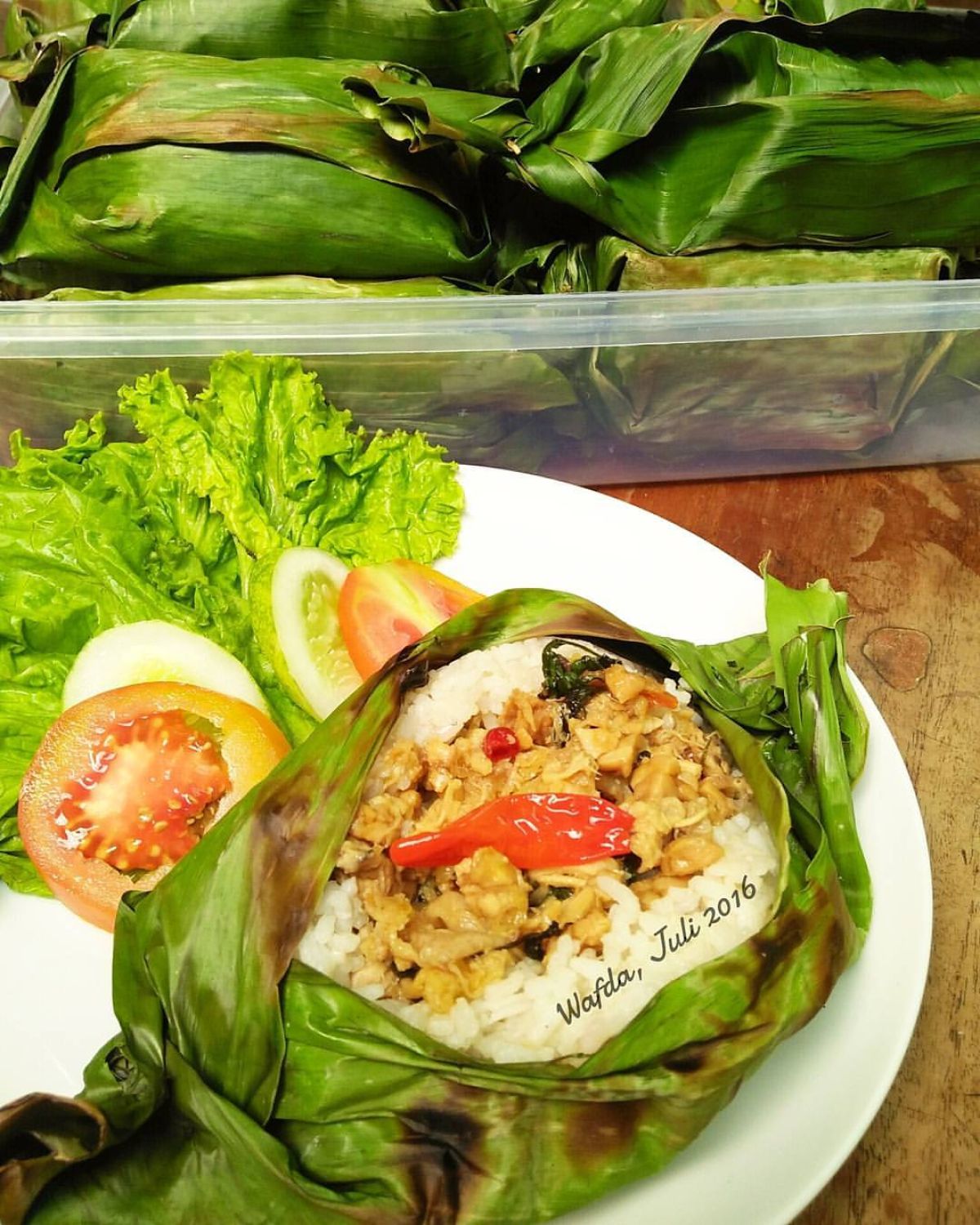 - Ambil dua lembar daun pisang dan tumpuk menjadi satu. Letakkan nasi di atasnya, kemudian beri tumisan ayam dan tempe.