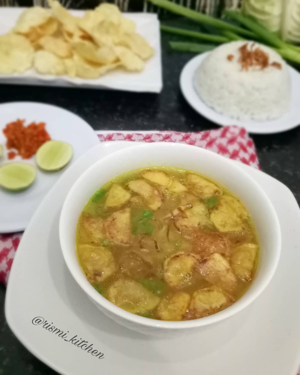 - Daun seledri dan bawang goreng untuk taburan