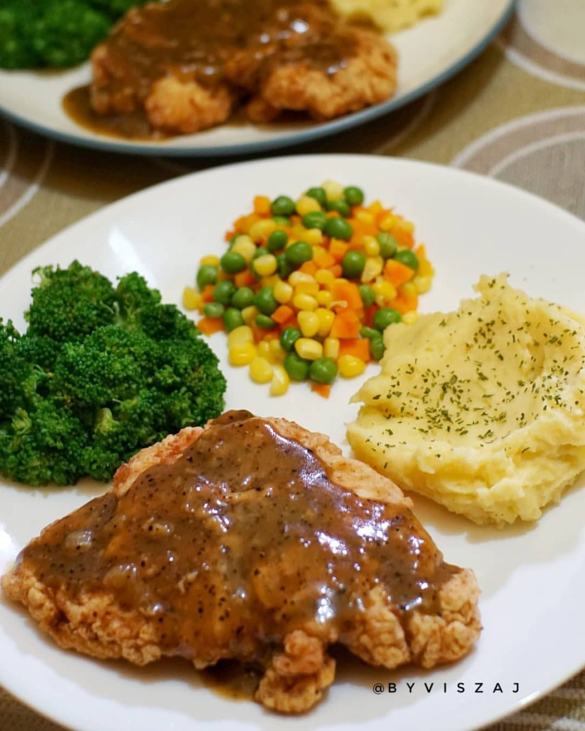 Tata semua bahan di atas piring. Letakkan brokoli, sayuran campur, mashed potato, dan ayam steak. Siram saus black pepper di atas ayam dan sajikan dengan hangat!