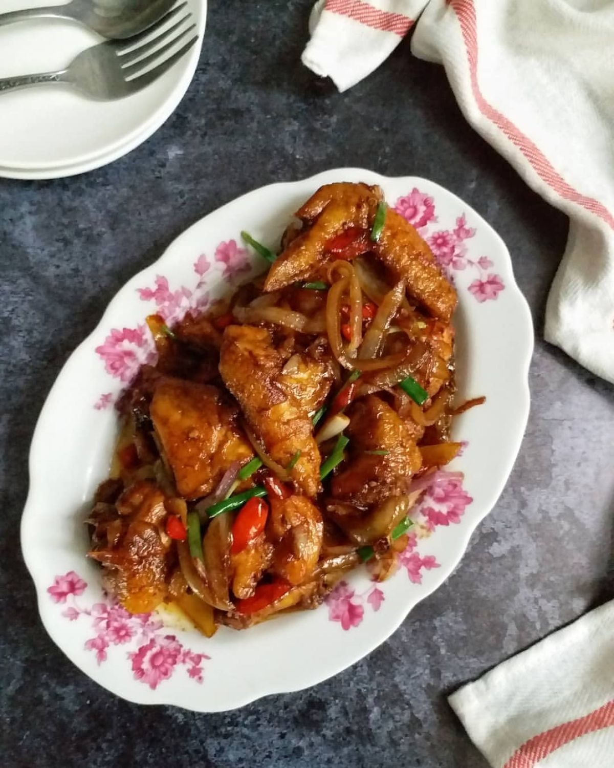 - Masukkan ayam ke dalam wajan. Aduk rata dengan cepat hingga ayam terbalur bumbu saus. Tambahkan daun bawang, dan aduk kembali. Jika dirasa kurang asin, bisa menambahkan sedikit garam. Angkat dari kompor.