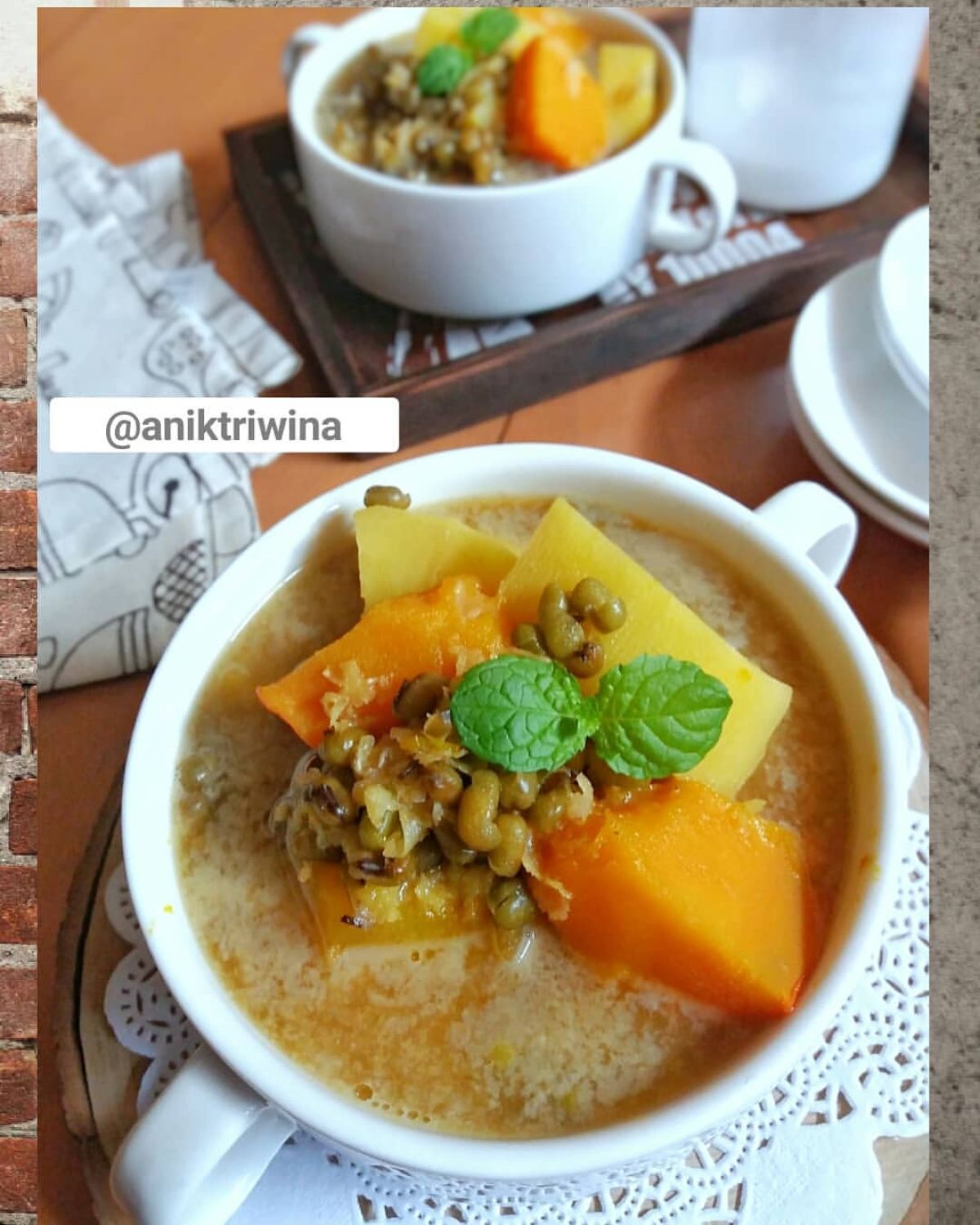 - Masukkan ubi jalar dan waluh: Setelah kacang hijau empuk, masukkan potongan ubi jalar dan waluh ke dalam panci. Rebus kembali hingga semua bahan empuk.