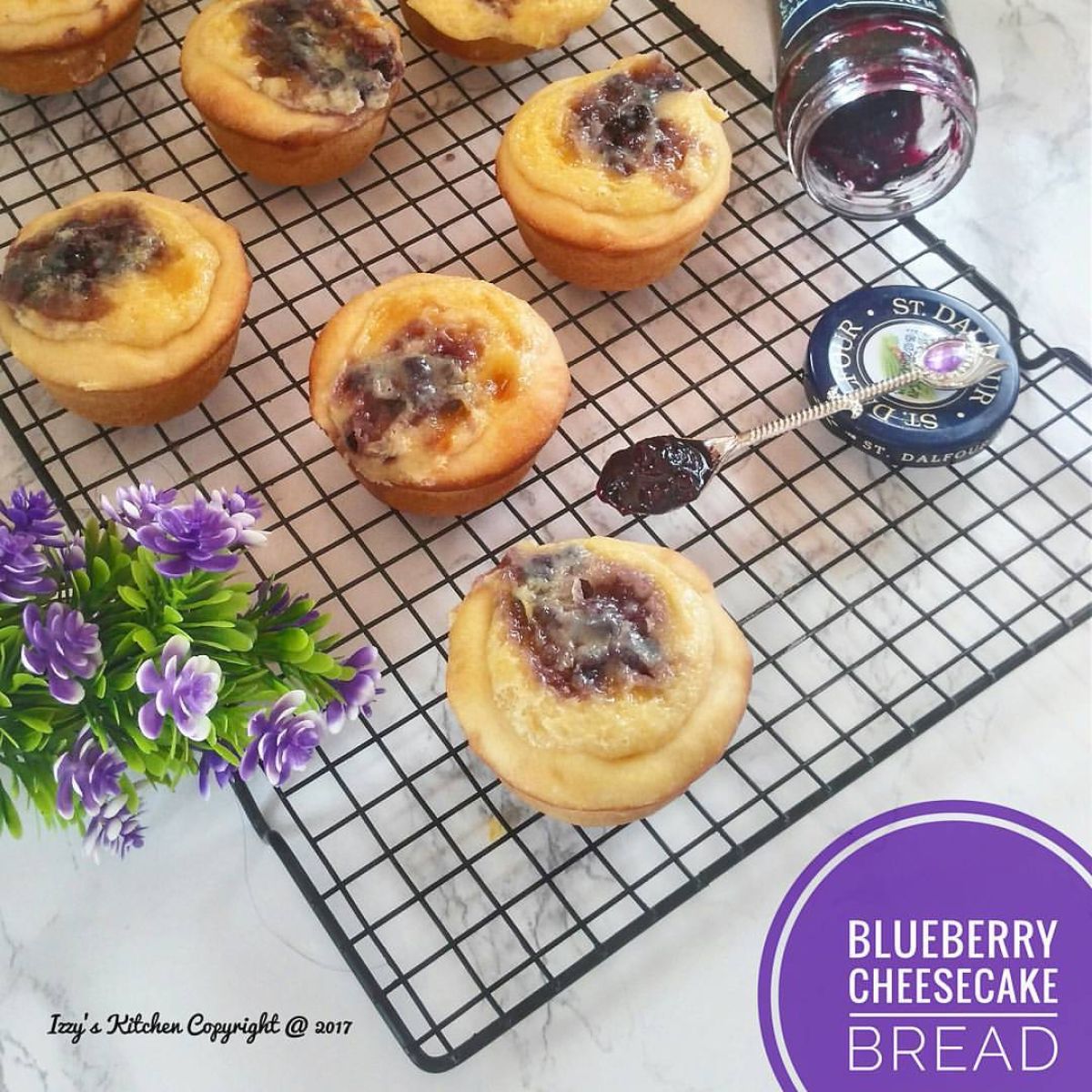 Setelah itu, isi setiap adonan dengan cheesecake dan tambahkan selai blueberry di atasnya. Panggang pada suhu 200 derajat Celsius selama 15 menit hingga matang. Wow, siap untuk disajikan!