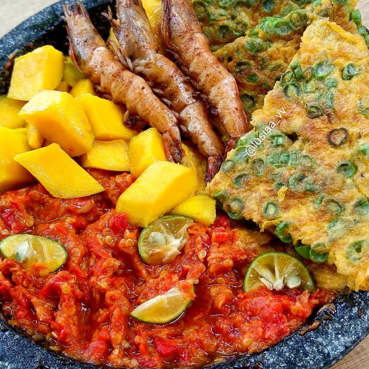 - Angkat sambal dan tambahkan air peras jeruk nipis, garam, dan gula pasir. Aduk hingga semua bahan tercampur rata.
