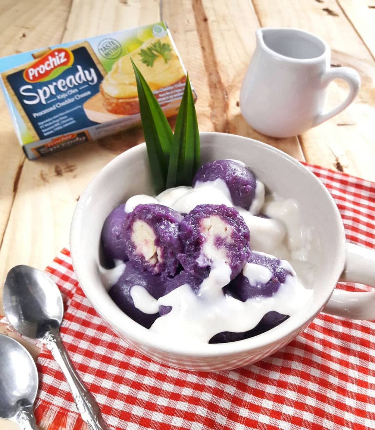 - Siapkan mangkuk saji. Tata bulatan ungu yang sudah direbus di atasnya, kemudian siram dengan saus keju di atasnya. Badak berendam saus keju siap disajikan!