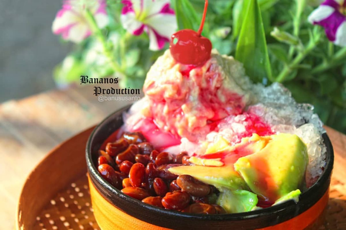 - Tambahkan es serut di atasnya, lalu tuangkan santan kental rebus yang telah disiapkan.