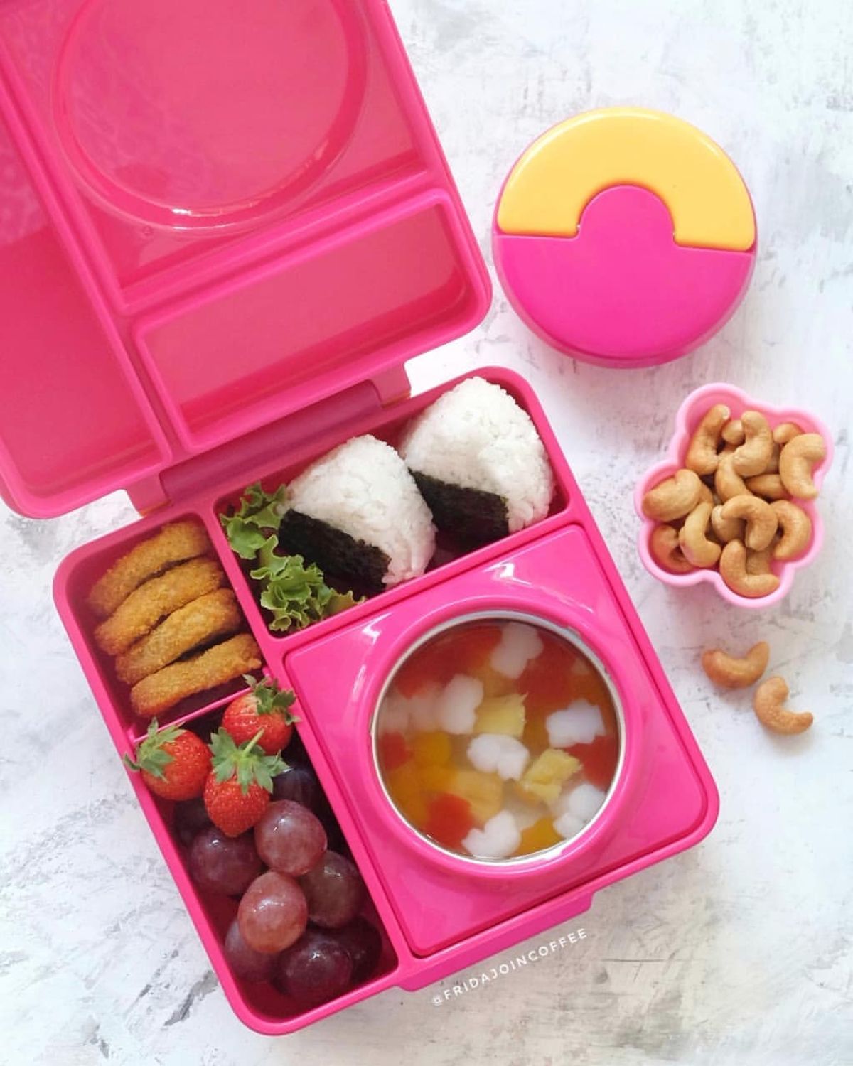 - Penyajian: Siapkan lunch box seperti @omieboxid yang punya berbagai sekat. Masukkan campuran nasi dan ayam di satu sisi, lalu letakkan sayuran di sampingnya. Jangan lupa tambahkan jeruk mandarin sebagai pencuci mulut!