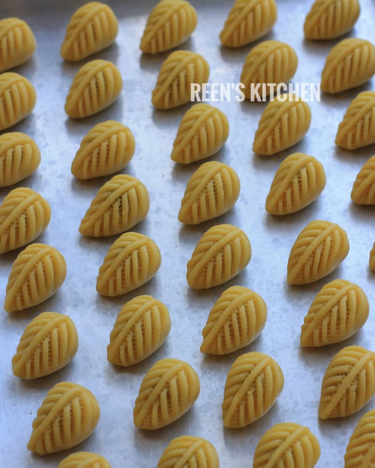 5. Ambil sebagian kecil adonan, pipihkan dengan rolling pin, dan gunakan cetakan untuk memotong adonan sesuai bentuk daun. Ini yang membuat kue kita unik!