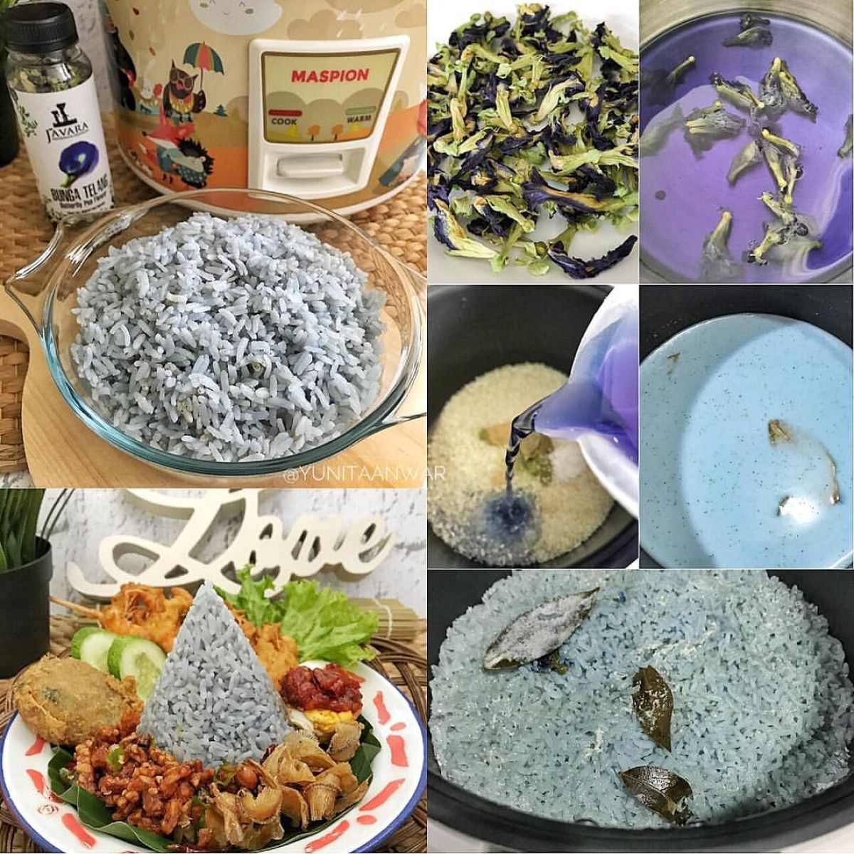 - Rebus Bunga Telang: Pertama, rebus 20 kuntum bunga telang dengan 450 ml air dalam panci. Lakukan ini selama kurang lebih 5 menit. Kamu akan melihat airnya berubah menjadi biru. Ini adalah langkah yang penting untuk mendapatkan warna cantik pada nasi.