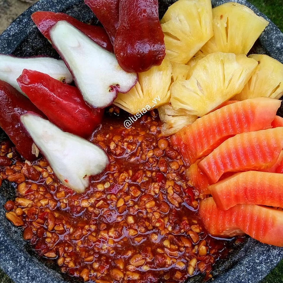 - Campurkan buah: Masukkan potongan buah yang sudah dipersiapkan ke dalam wadah. Tuangkan bumbu yang sudah diulek di atasnya, lalu aduk perlahan hingga semua buah terlapisi bumbu.