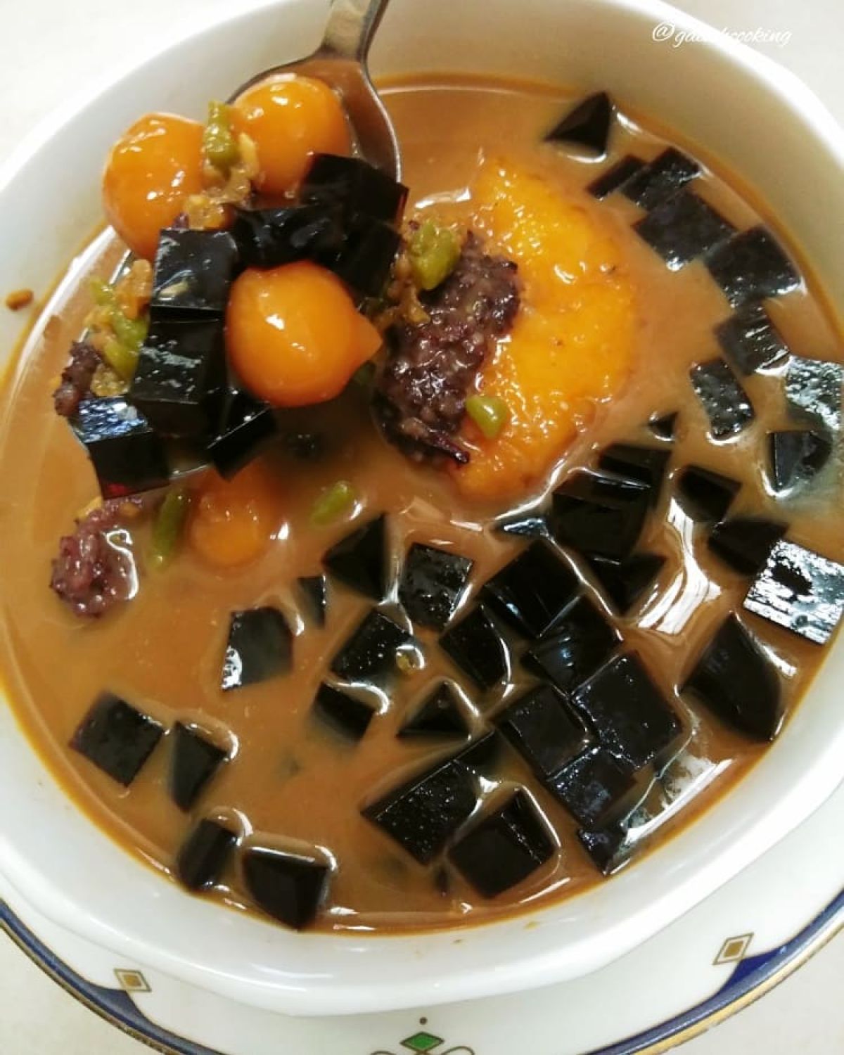 - Di dalam mangkuk besar, campurkan semua bahan: ketan hitam, lupis, cendol, kacang merah, tape, candil, dan cincau.