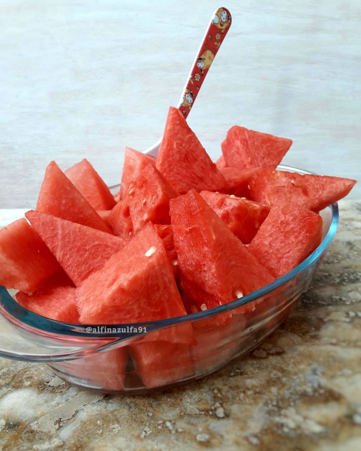 - Tambahkan Garam (Opsional): Jika suka, taburkan sedikit garam pada potongan semangka untuk meningkatkan rasa manisnya.