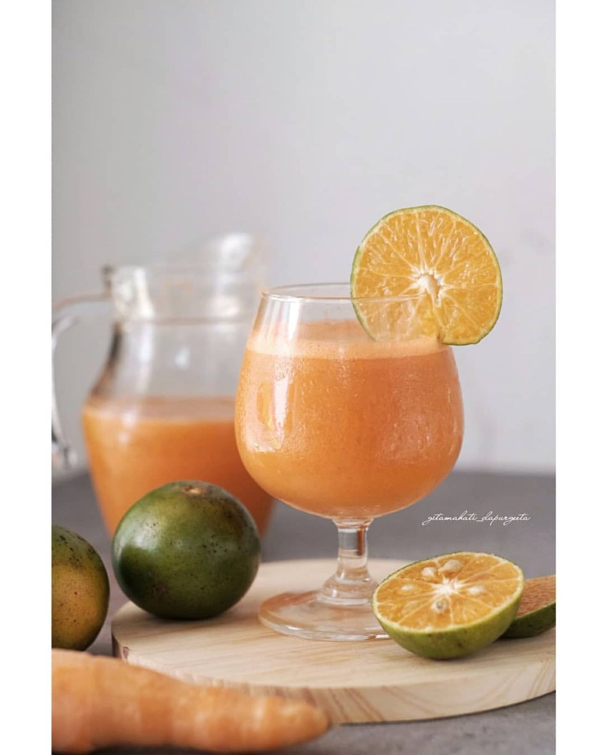 - Campurkan air jeruk dengan jus wortel yang sudah dihasilkan tadi, lalu aduk sampai merata.