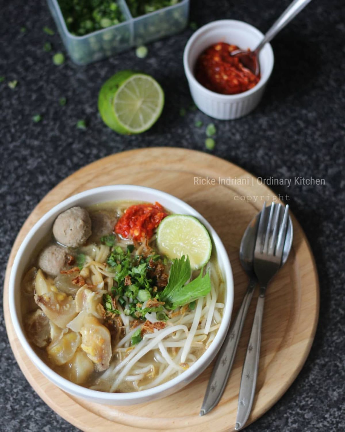 - Didihkan air, lalu taruh mie dan tauge secukupnya ke dalam saringan. Masukkan ke dalam air panas sebentar sambil diaduk hingga tauge agak layu. Angkat dan masukkan ke mangkuk saji. Beri kikil, bakso sapi, dan kuah kaldu secukupnya. Taburkan daun bawang, daun seledri, dan bawang goreng. Sajikan dengan air jeruk nipis dan sambal rebus.