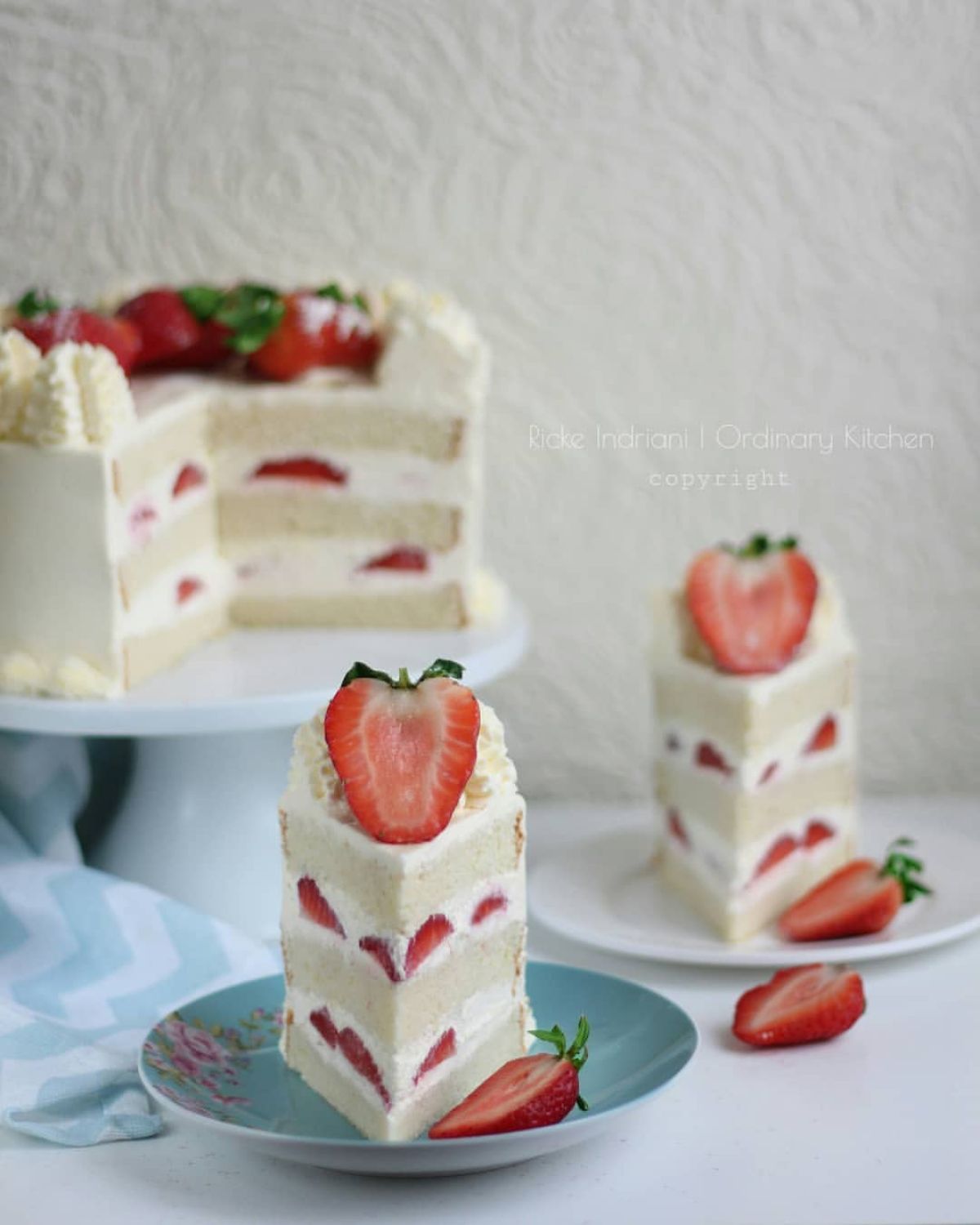 - Basahi tiap lapisan cake dengan simple syrup, oleskan whipped cream, dan tata potongan stroberi. Ulangi untuk setiap lapisan hingga selesai. Hias bagian atas kue dengan whipped cream dan stroberi. Dinginkan di dalam kulkas minimal 2 jam sebelum disajikan.