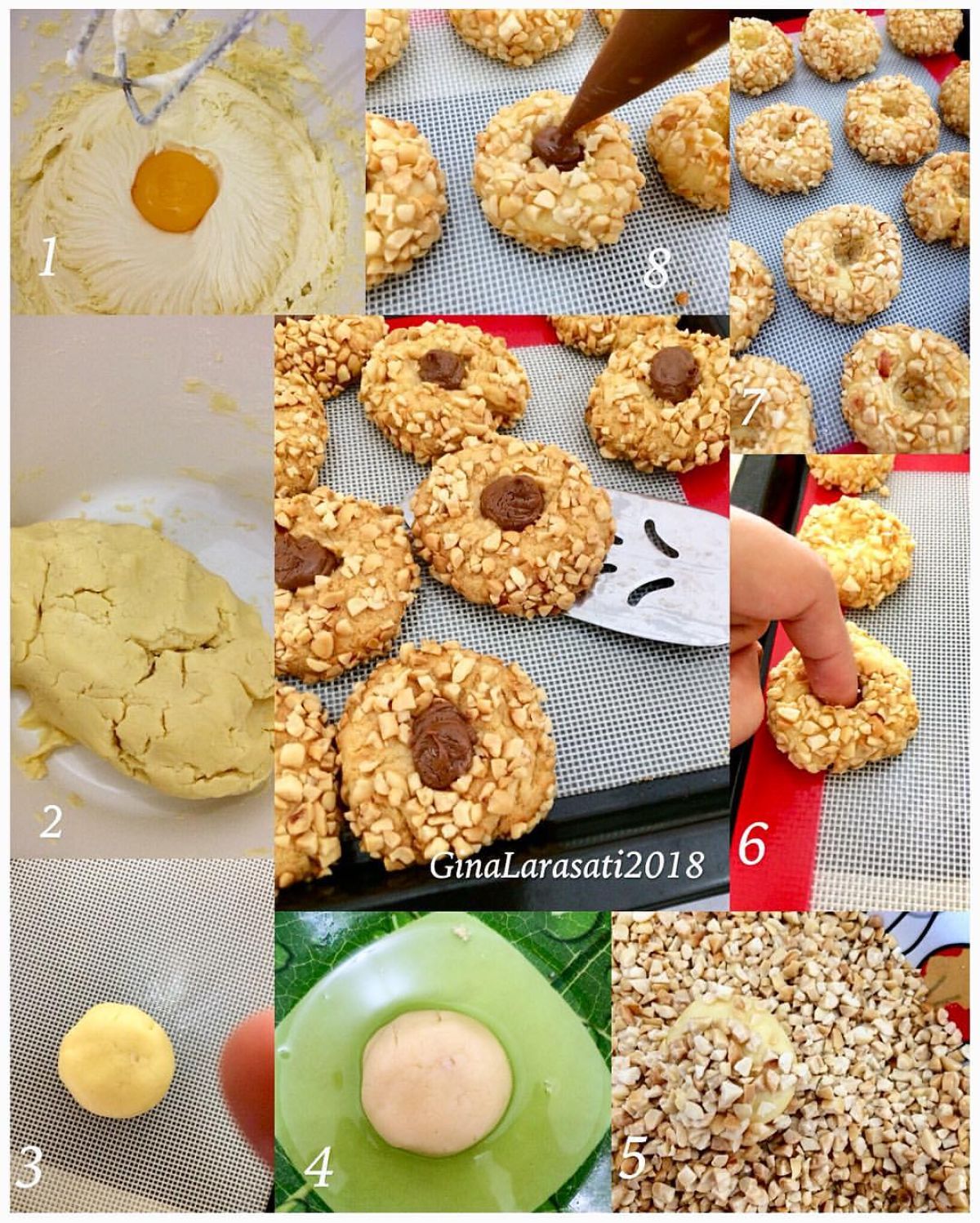 - Setelah adonan cukup siap, bulatkan masing-masing adonan sekitar 15 gram. Celupkan ke dalam putih telur, kemudian gulingkan pada kacang mede sangrai agar menempel.
