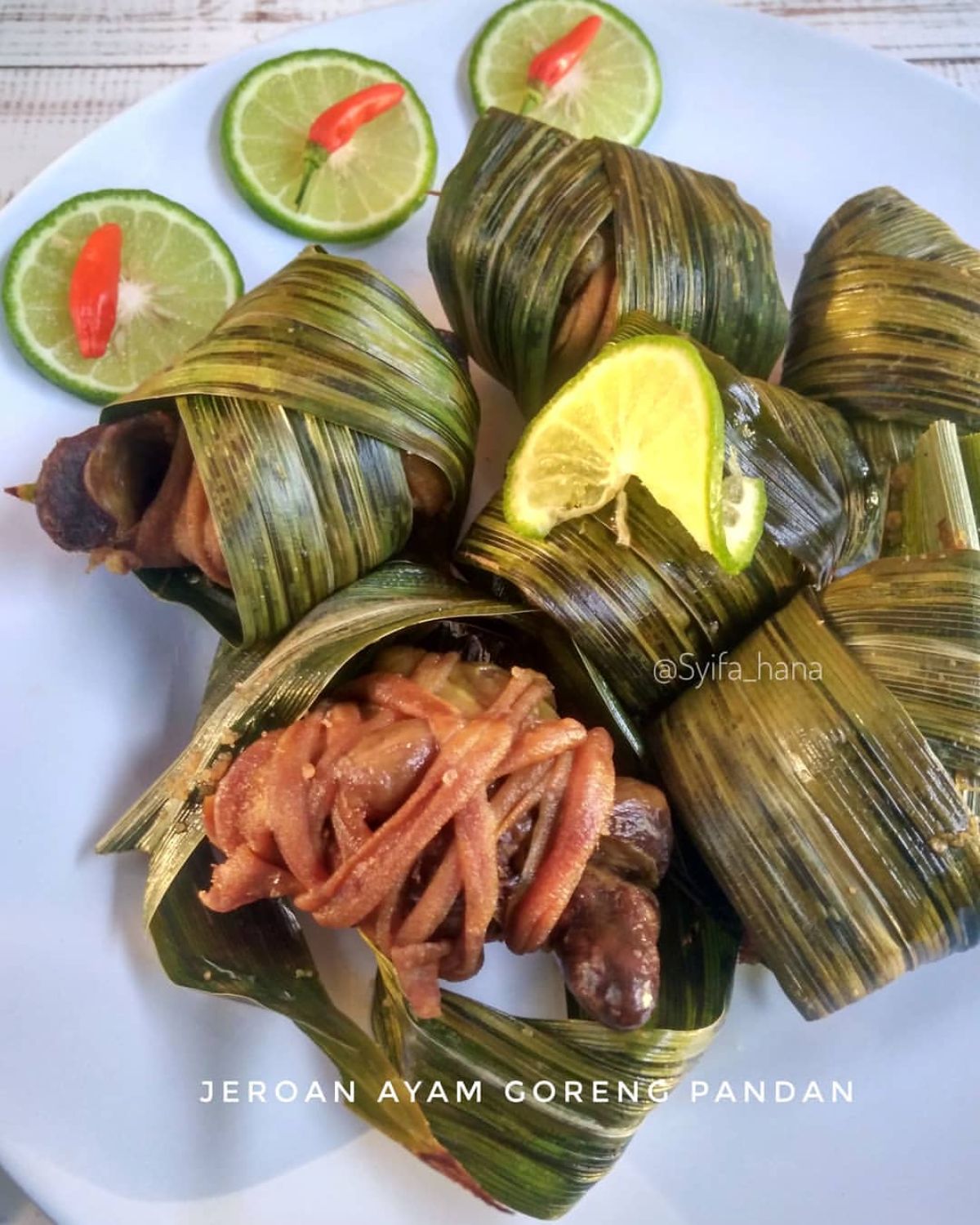 - Tiriskan dan biarkan dingin. Ambil daun pandan secukupnya untuk membungkus jeroan. Semat ujung daun pandan dengan tusuk gigi agar tidak terbuka saat digoreng.