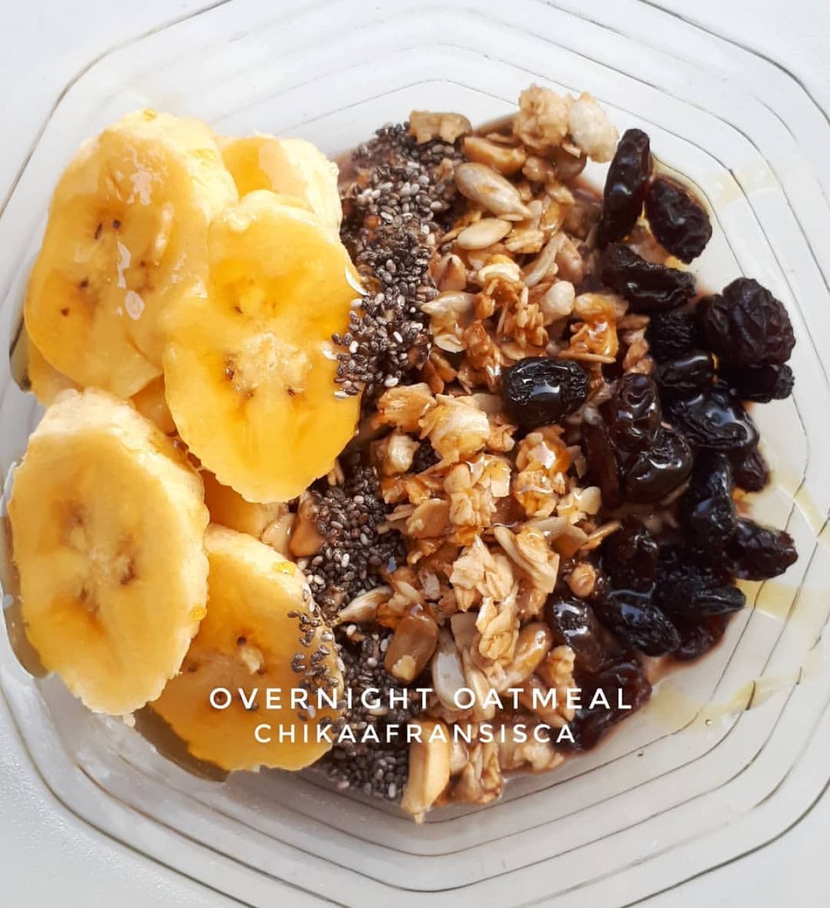 - Di pagi hari, ambil makanannya dari kulkas. Sajikan di mangkuk dan tambahkan toping sesuai selera, seperti irisan pisang, kismis, granola, biji chia, dan drizzling madu di atasnya.