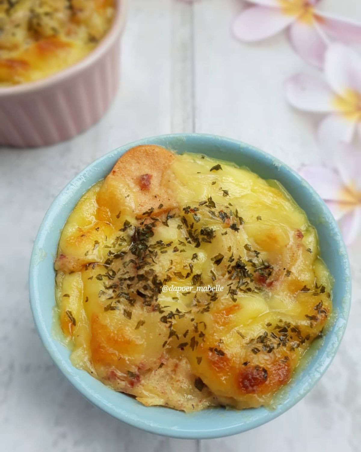 - Panggang dalam oven pada suhu 180°C selama sekitar 30 menit atau hingga bagian atasnya berwarna kuning kecokelatan. Setelah matang, angkat dan biarkan sejenak sebelum disajikan.