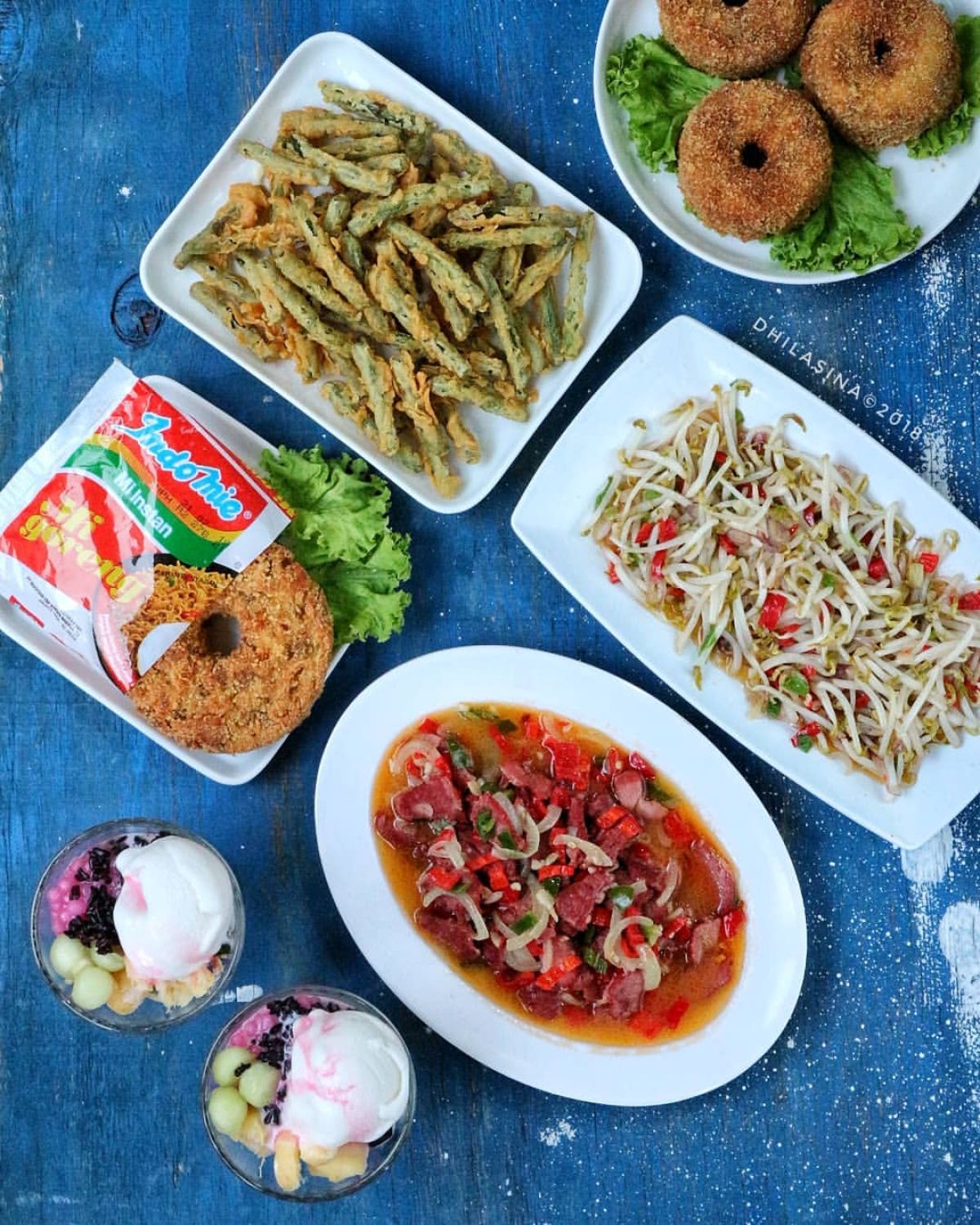 Sajikan donat Indomie di atas piring, tambahkan sayur toge dan buncis goreng tepung di sampingnya. Hidangan Se'i Sapi Pedas bisa disajikan di atasnya atau terpisah. Sempurna untuk buka puasa, kan?