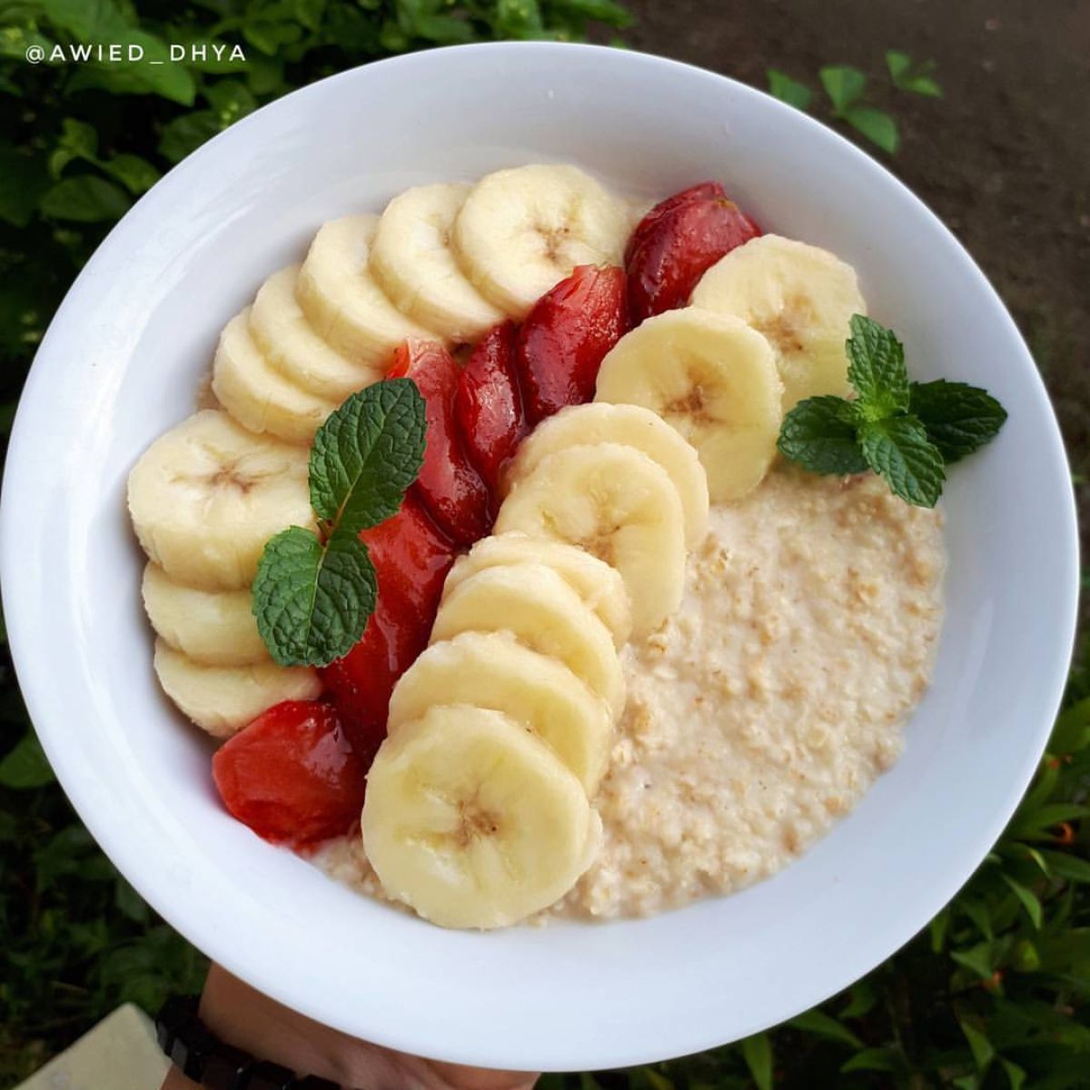 - Mencampur: Setelah oatmeal matang, angkat dari kompor dan sajikan dalam mangkuk. Tambahkan irisan pisang dan stroberi di atasnya.