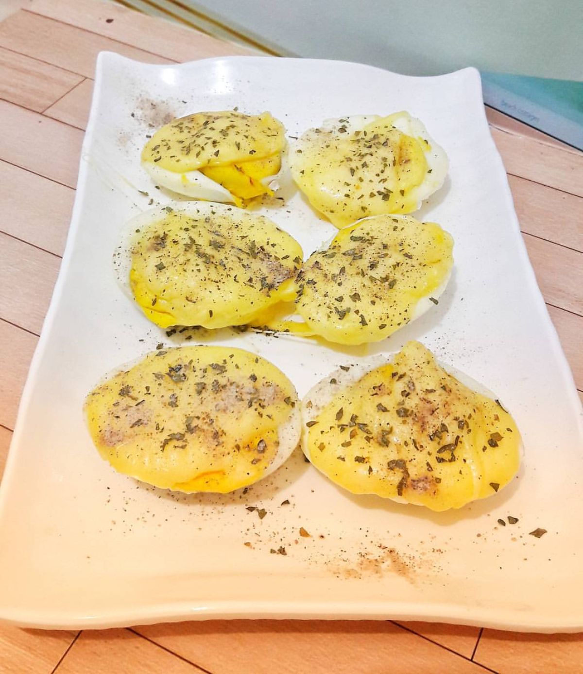 - Setelah matang, angkat telur dari oven. Taburi dengan garam, lada bubuk, dan parsley cincang di atasnya.