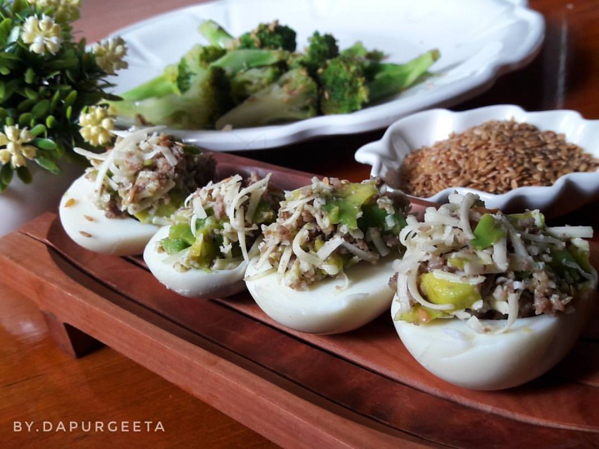 Siapkan telur putih isi di atas piring, dan sajikan bersama brokoli tumis. Rasakan kombinasi rasa yang segar dan gurih dari alpukat dan daging.