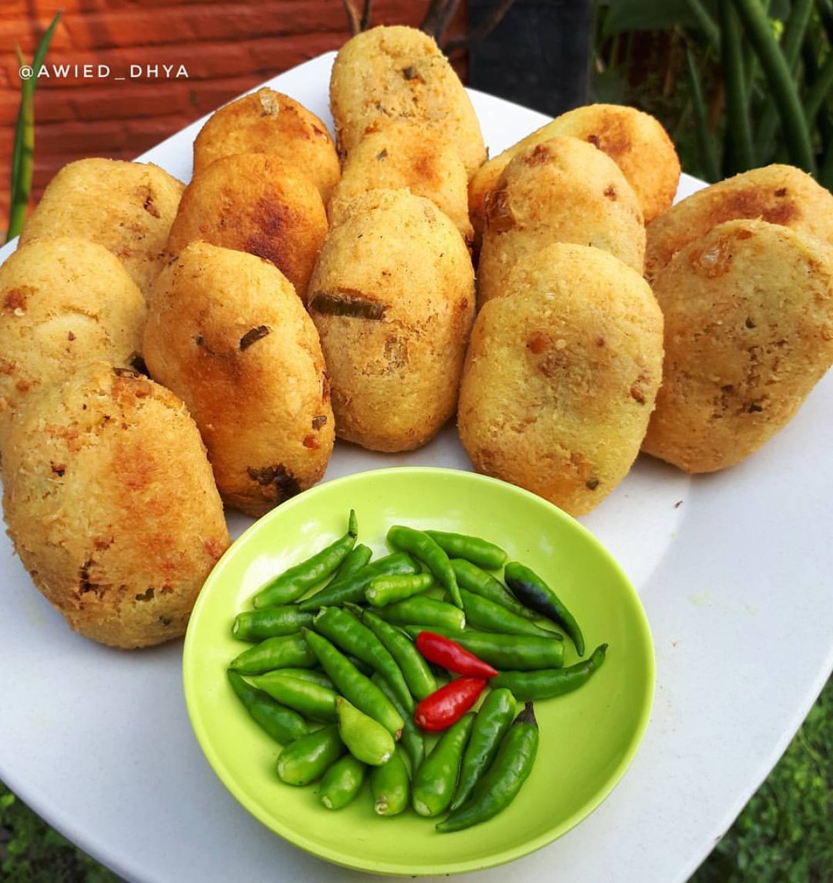 - Ambil sedikit adonan singkong, pipihkan, kemudian isi dengan campuran tempe. Bentuk adonan menjadi bulatan lonjong.