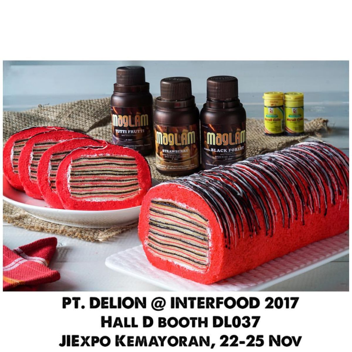 4. Menyusun lapisan: Ambil satu crepe, oleskan saus coklat Maglam Blackforest, lalu tambahkan selai strawberry di atasnya. Susun crepe satu demi satu hingga semua lapisan selesai.