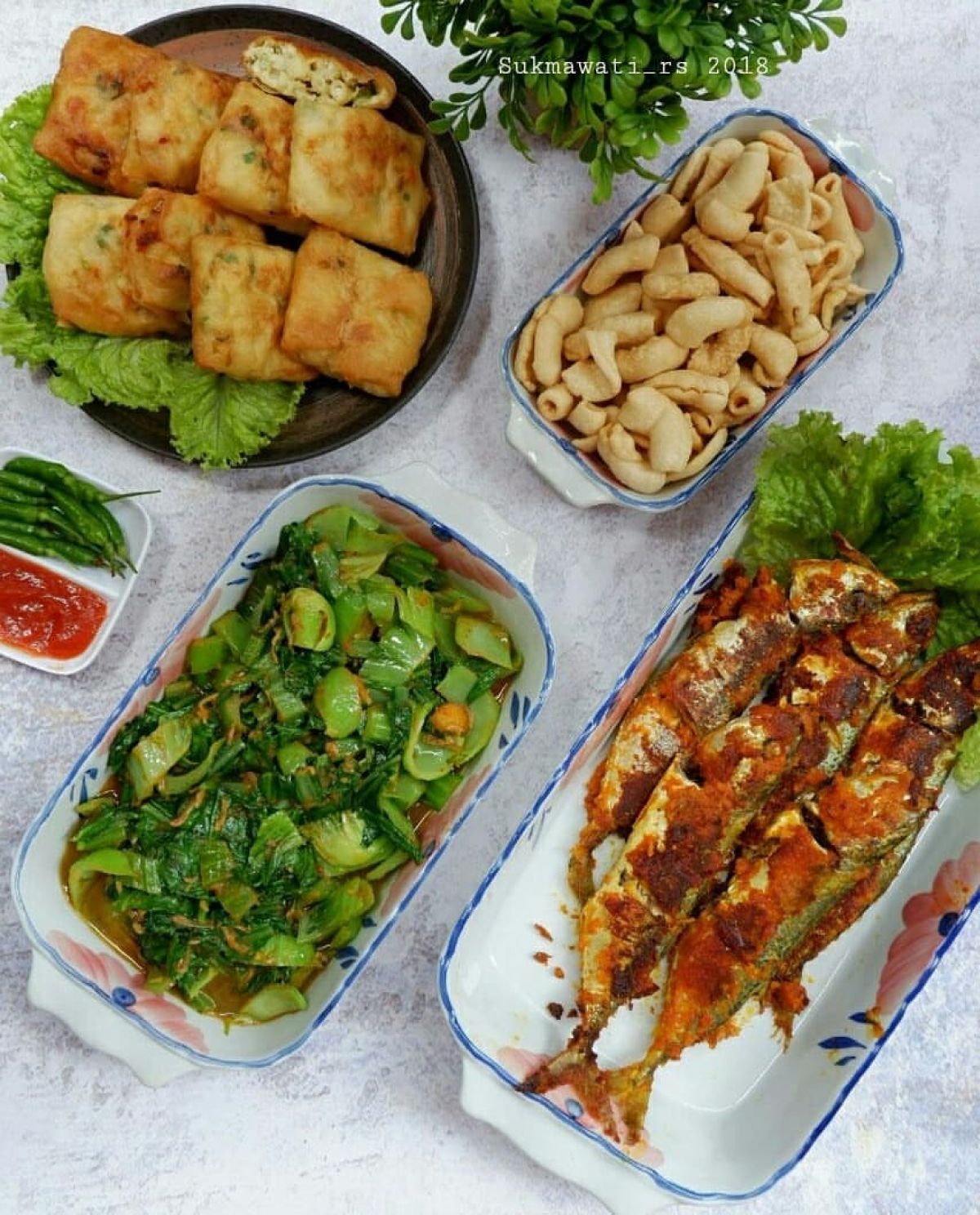 - Siapkan semua hidangan di meja makan! Sajikan Kembung Bakar, Tumis Sawi Pahit dengan Teri, dan Martabak Makaroni. Jangan lupa kerupuk sebagai pelengkap.