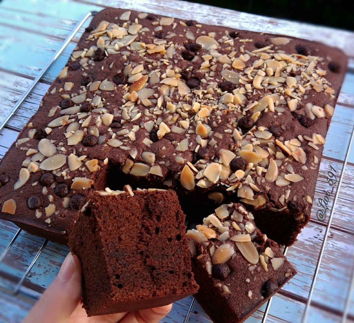 - Tuang adonan ke dalam loyang yang sudah disiapkan. Tambahkan topping yang diinginkan seperti almond dan chocochip.