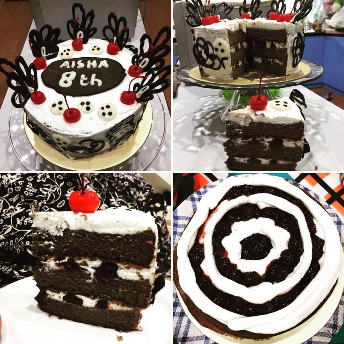 - Perciki permukaan kue dengan simple syrup agar tidak kering. Tuang whipped cream di atasnya dan tambahkan vla dark cherry di atas whipped cream.