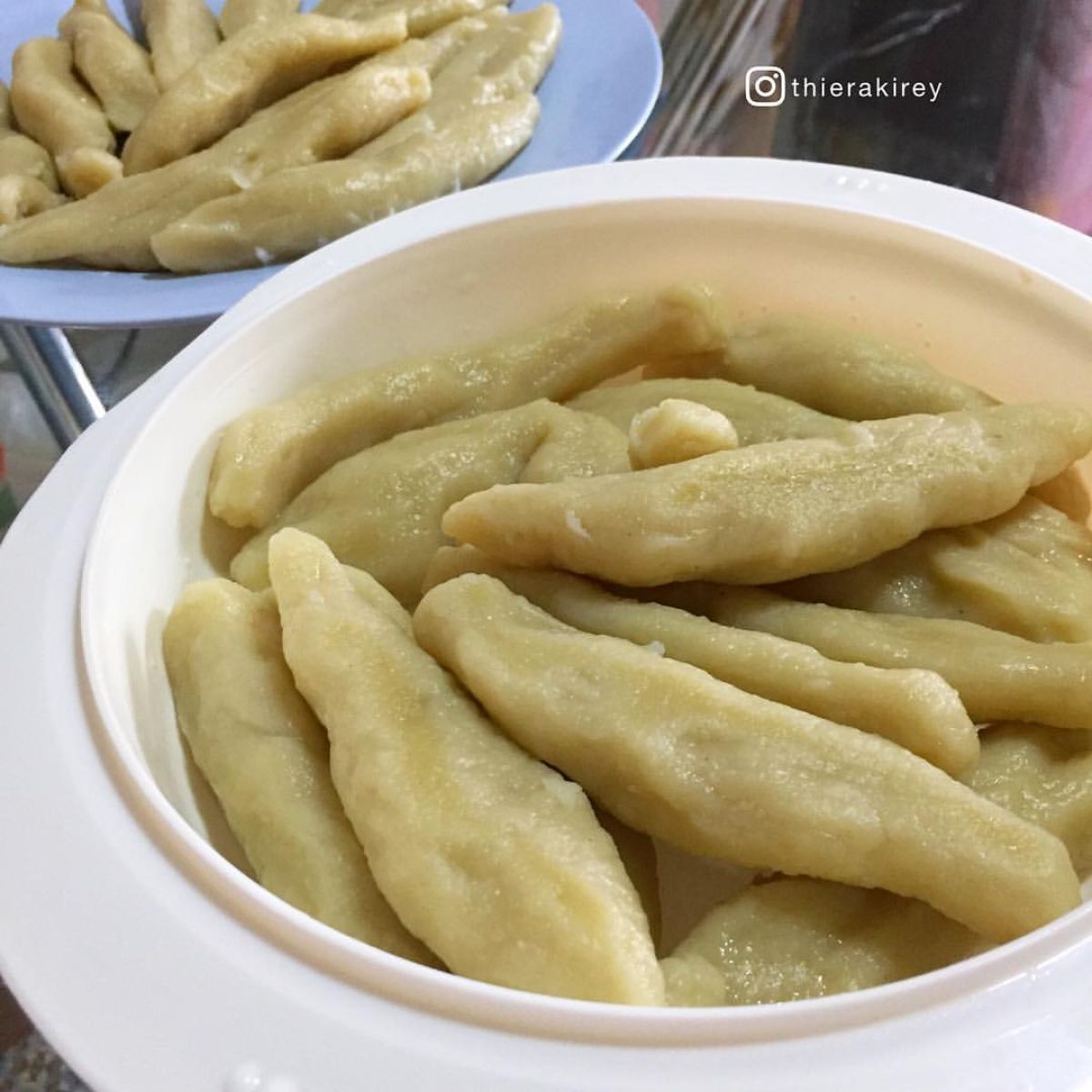 4. Ambil selembar daun pisang, kemudian letakkan satu sendok makan adonan ikan tenggiri di atasnya. Lipat daun pisang dan rapatkan, bisa dibantu dengan lidi untuk mengikatnya agar tidak terbuka saat dikukus.