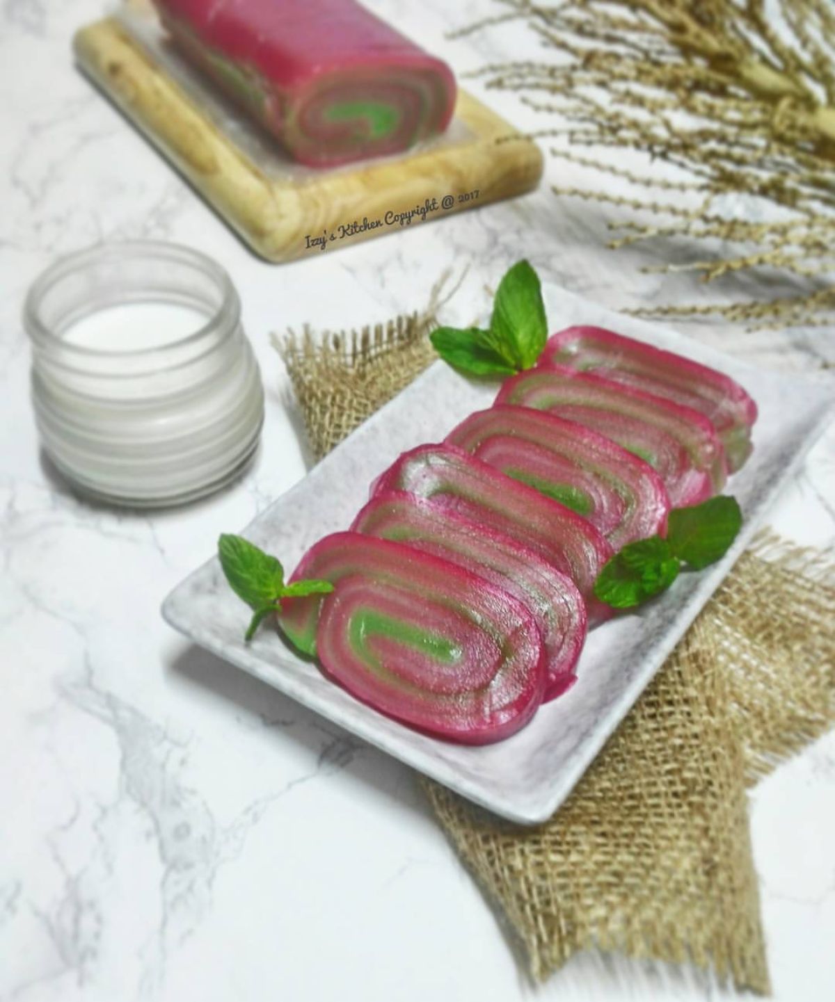 - Tuang 125 ml adonan putih ke dalam cetakan dan kukus selama 5 menit dengan api sedang. Setelah itu, tuang adonan merah sebanyak 125 ml dan kukus lagi selama 5 menit. Lanjutkan dengan adonan hijau, kukus selama 5 menit. Ulangi proses ini hingga semua adonan habis.
