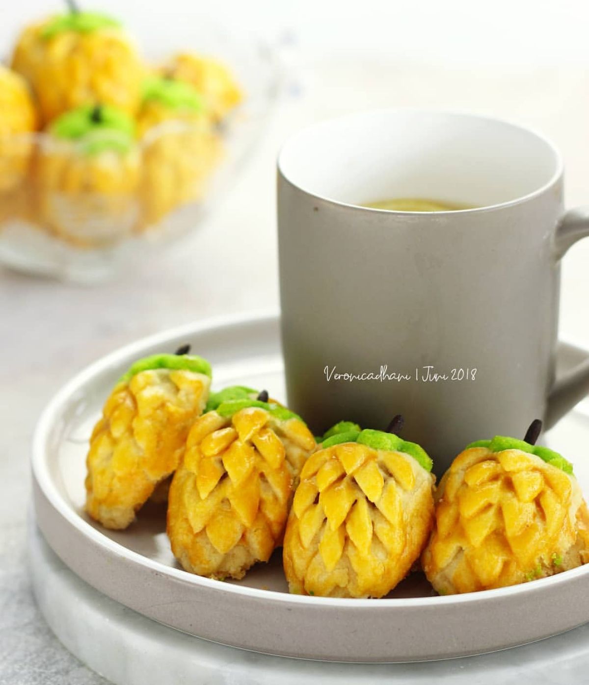 - Penyelesaian: Tempelkan adonan hijau yang sudah dicetak di pangkal nastar, lalu tambahkan cengkih sebagai tangkai. Gunakan gunting kecil untuk memotong bagian atas kue agar terlihat cantik.