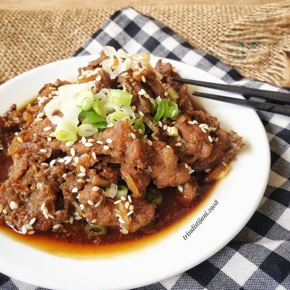 - Sajikan bulgogi selagi hangat dengan taburan sisa wijen sangrai dan daun bawang di atasnya.
