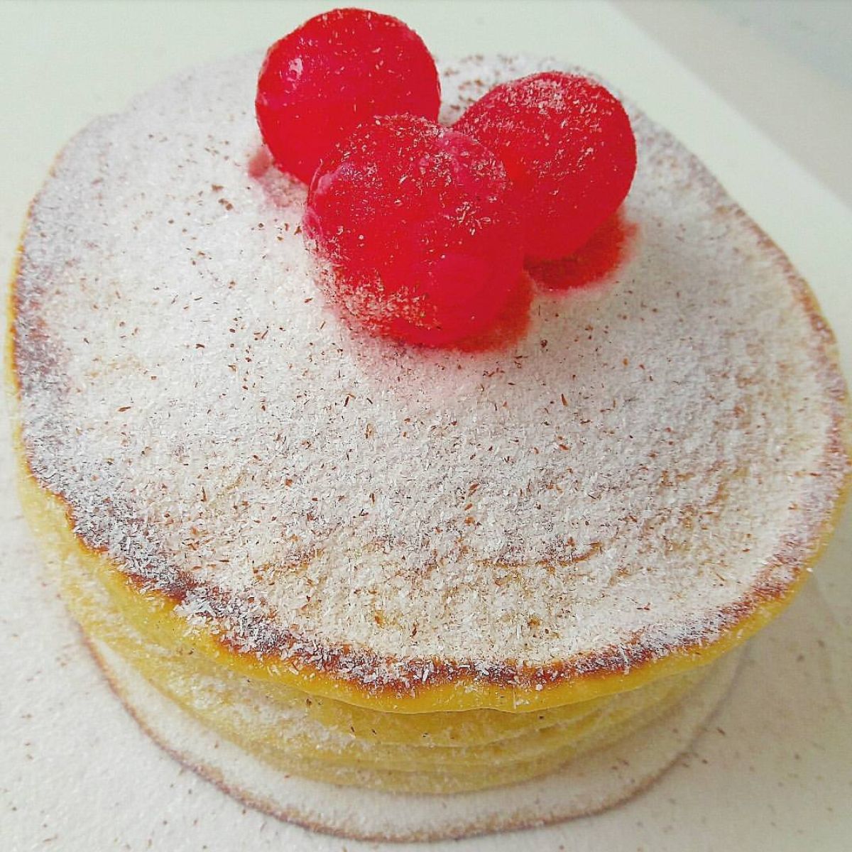 - Angkat pancake dan sajikan di piring. Taburi dengan gula halus dan tambahkan ceri segar di atasnya sebagai topping.