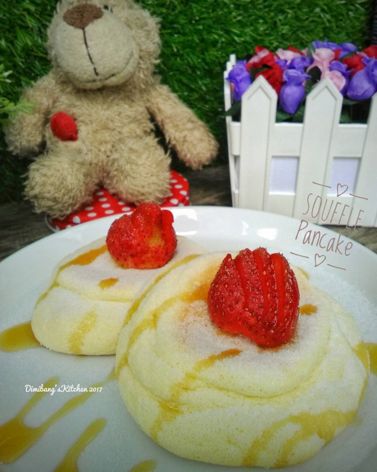 - Sajikan souffle pancake dengan topping maple syrup atau madu, taburkan gula halus, dan tambahkan buah strawberry atau buah favoritmu di atasnya.