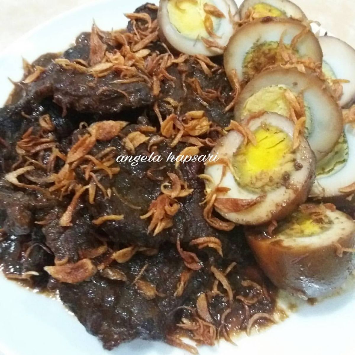 - Tambahkan lagi air secukupnya. Masak sampai daging empuk dan air menyusut. Angkat dan sajikan dengan taburan bawang goreng di atasnya agar lebih nikmat.